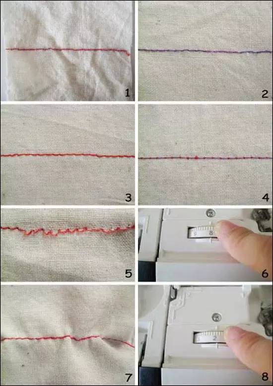 4)縫料皺縮:面、底線張力都過大,兩線的交合點(diǎn)處于縫料之間,但縫料產(chǎn)生皺縮(特別是薄料)和不平直,稍微用力一拉縫料,就會(huì)使縫線拉斷。解決方法:減小面線、底線的張力即可。(如圖7、8)